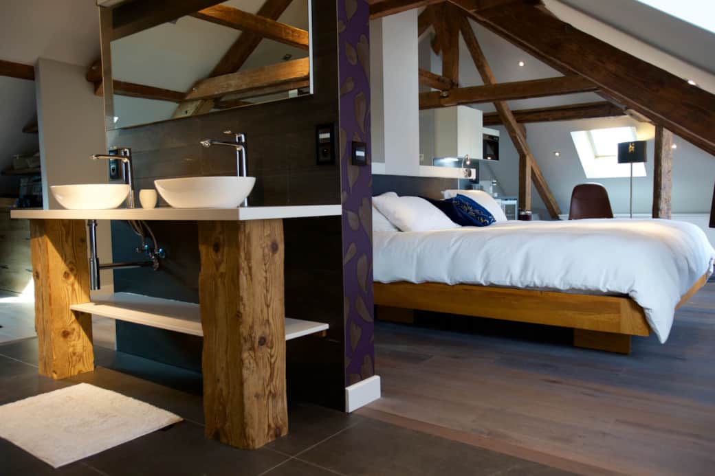 A tranquil retreat adorned in soothing blue tones, this suite offers a serene ambiance for restful nights. Elegant furnishings, plush bedding, and thoughtfully chosen decor create an atmosphere of understated luxury. Enjoy year-round comfort with air conditioning and underfloor heating, while generous built-in wardrobes enhance convenience. Windows invite in natural light along with captivating views of Lake Annecy and the charming ancient barn, making this haven as picturesque as it is restful. 15m2