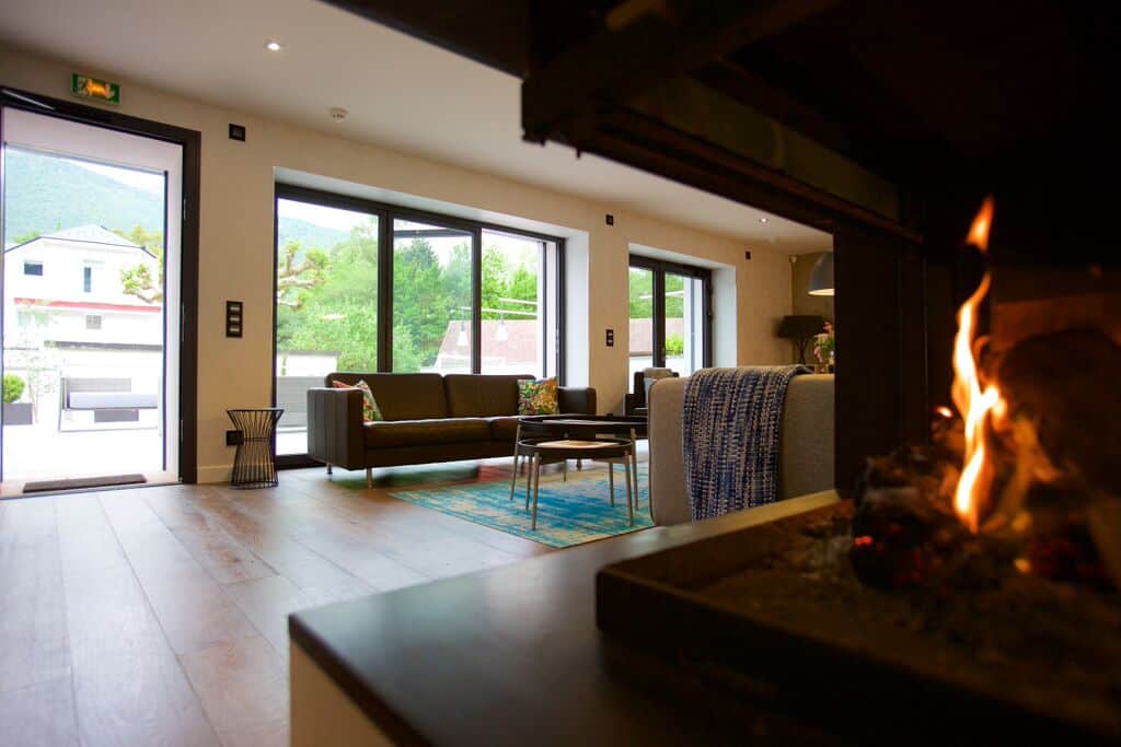 For laidback moments and family gatherings, the Fireside Media Lounge offers a warm, contemporary space to relax after adventurous days on the lake or in the Alps. Sink into the plush sectional sofa and enjoy cinematic experiences on the 65-inch flatscreen TV, with the added comfort of air conditioning and underfloor heating to suit every season. A modern fireplace adds to the cozy ambiance, while a piano in the corner invites impromptu music sessions—creating the ideal setting for memorable evenings together.