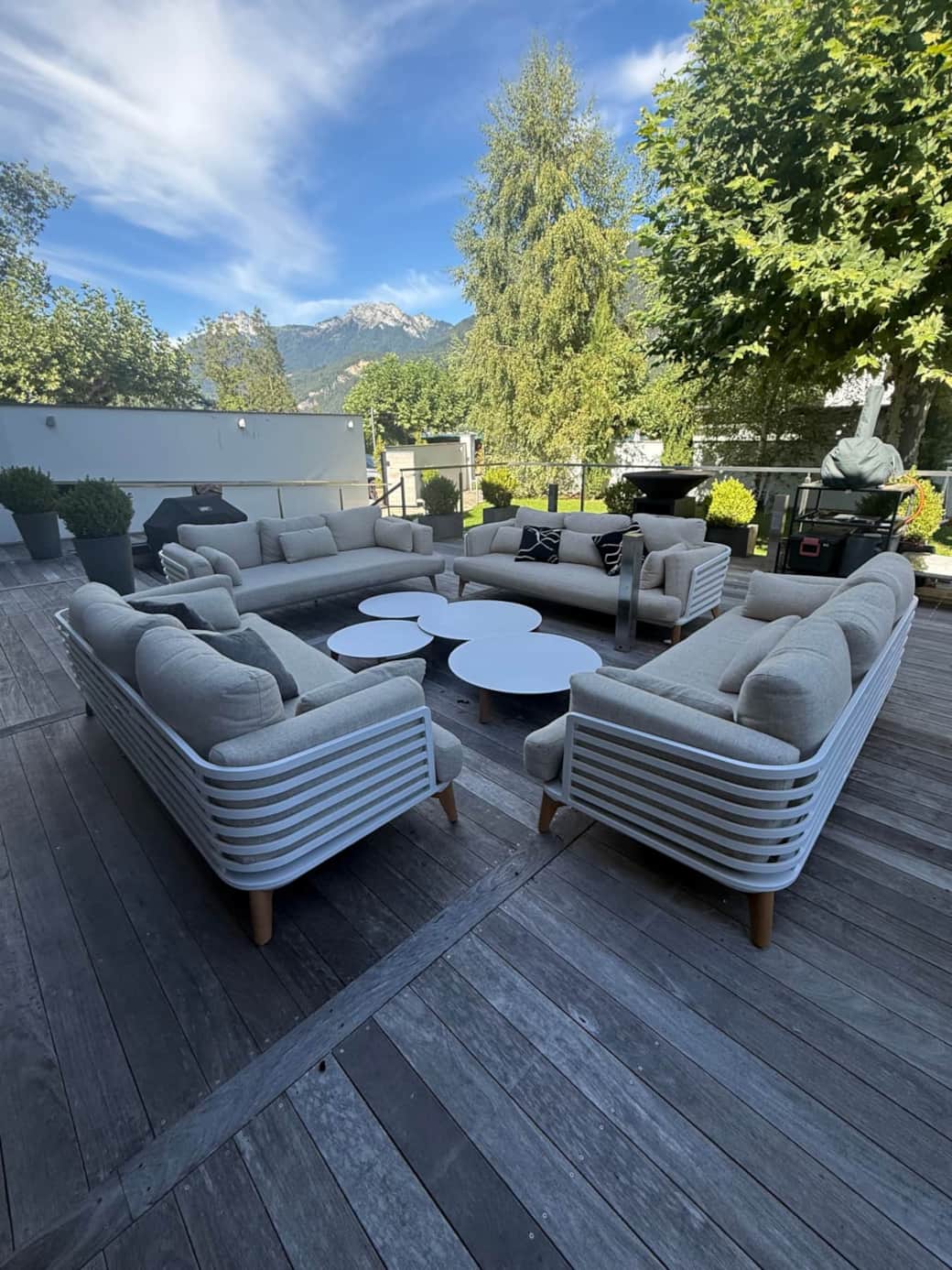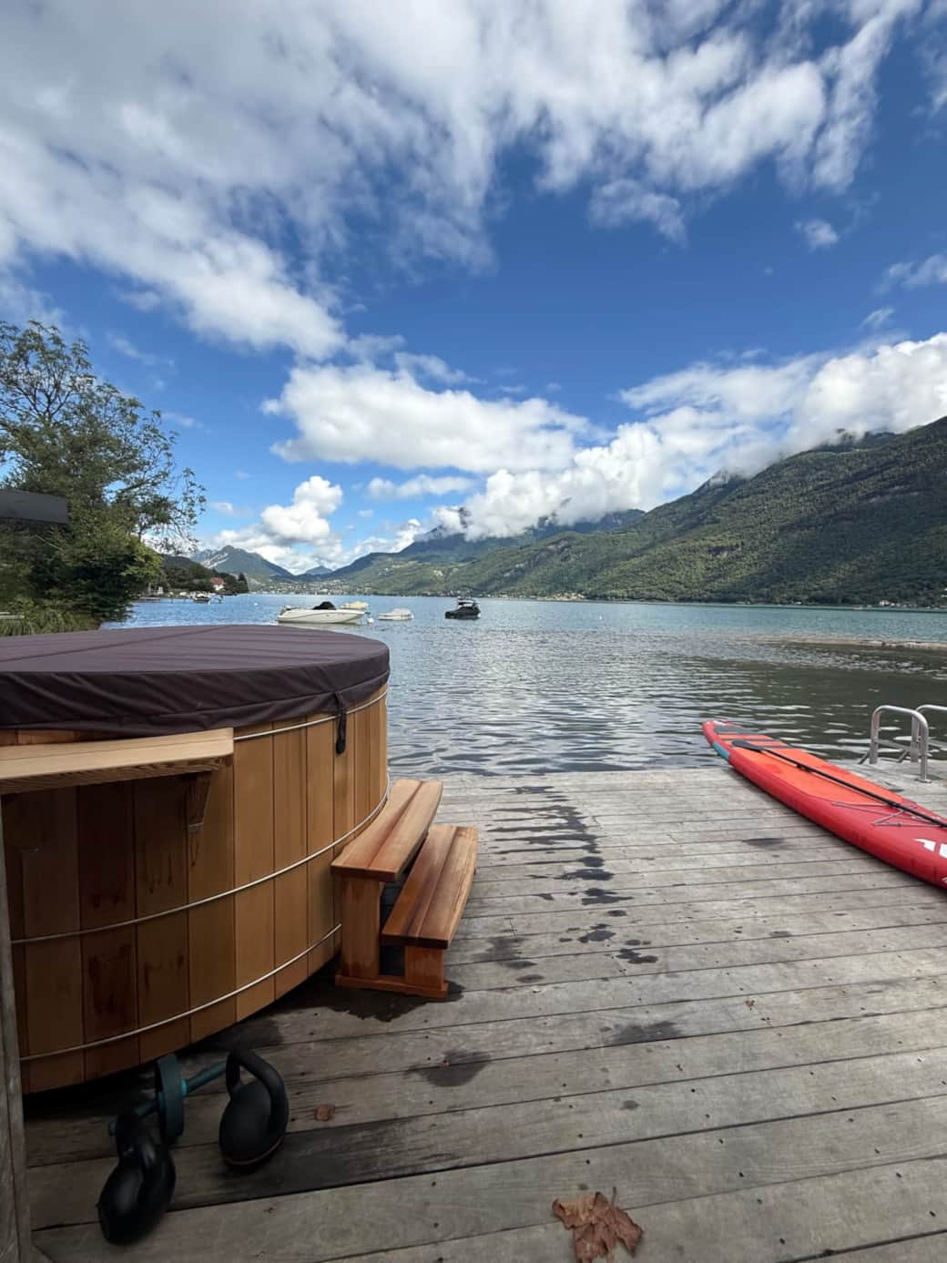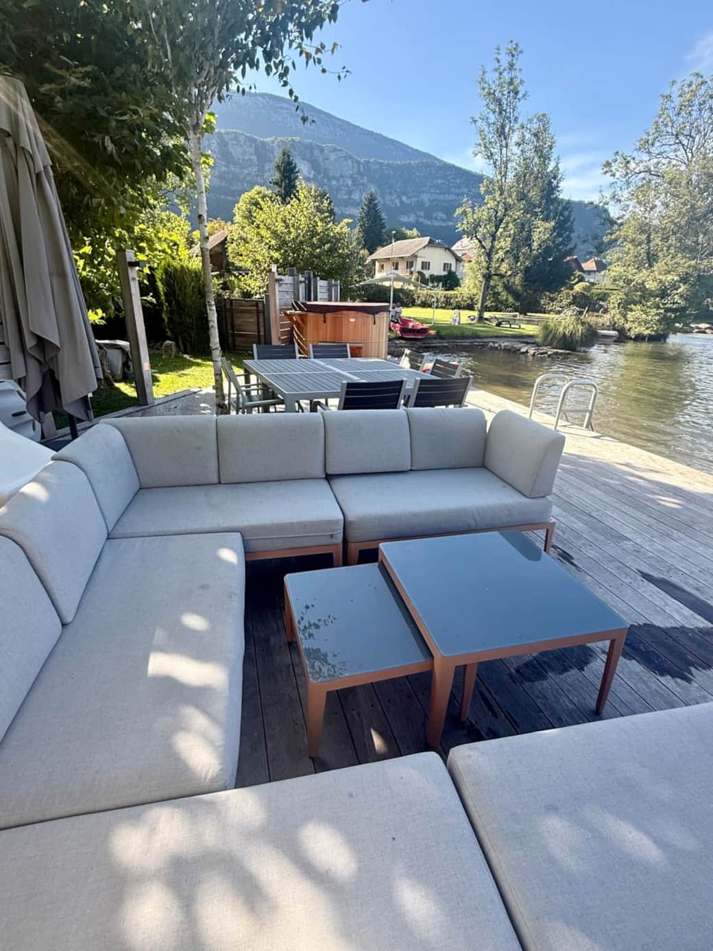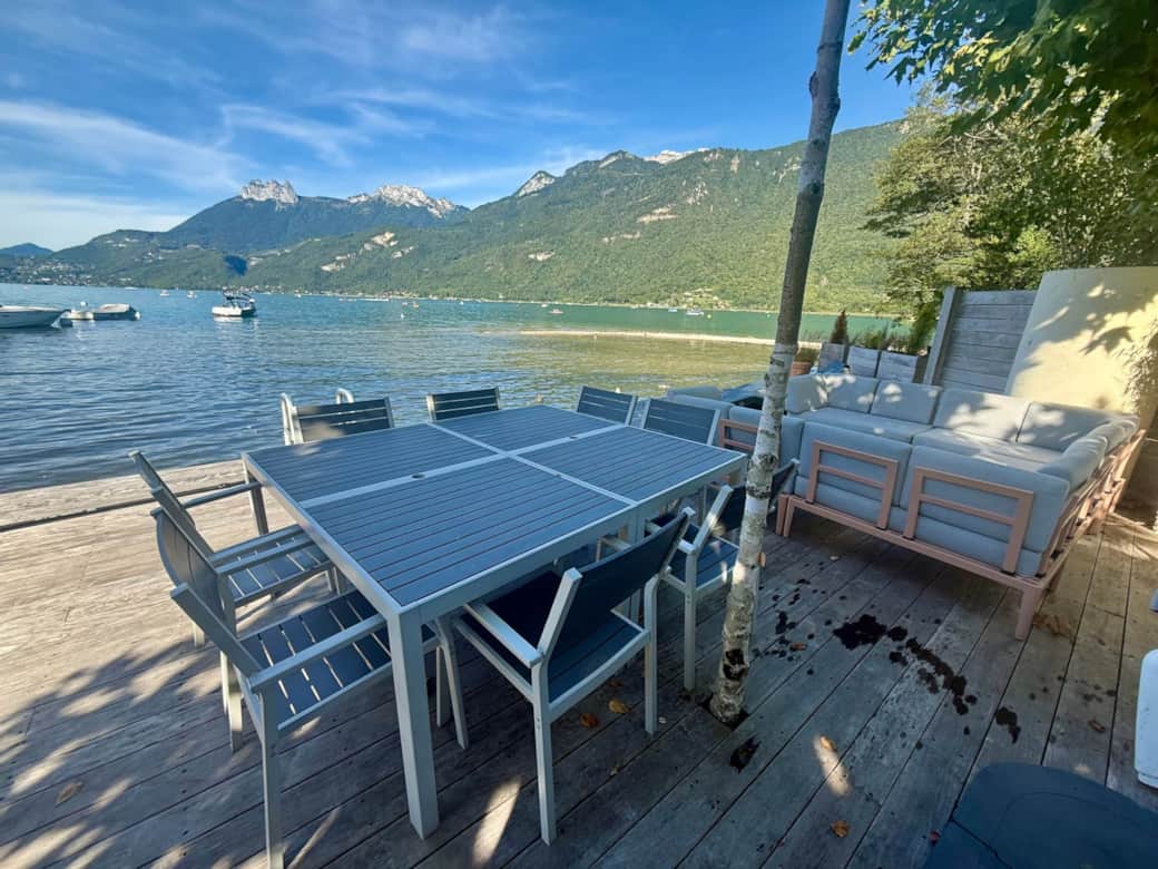 The expansive private lakeside deck (a rare luxury on Lake Annecy), where a communal teppanyaki-style wood-fired BBQ, Weber grill, dining table for eight, and sofas for nine set the scene for unforgettable lakeside moments.